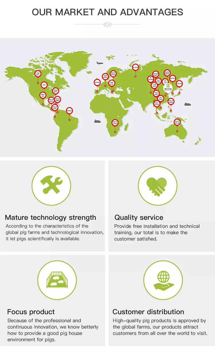 Deba Brothers® هي شركة متخصصة في تصنيع الأكشاك ذات الوصول المجاني في الصين. تتميز أكشاكنا ذات الوصول المجاني بتصميم سهل الاستخدام، ويمكن تطبيقها على نطاق واسع في مزارع الخنازير بجميع أحجامها، وتوفر متانة استثنائية باستخدام مواد متميزة وحرفية ممتازة. لقد حظي هذا المنتج باستقبال جيد من قبل مربي الماشية في جميع أنحاء العالم، وقد تم التحقق منه بشكل كامل لأدائه المستقر وفعاليته العالية من حيث التكلفة.